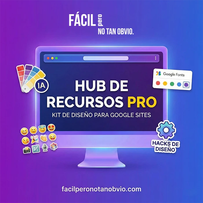 He recopilado para ti las herramientas mencionadas en mi videotutorial para que el diseño de tu web con Google Site se vea genial: generadores de color con IA, bibliotecas de iconos y hacks visuales.